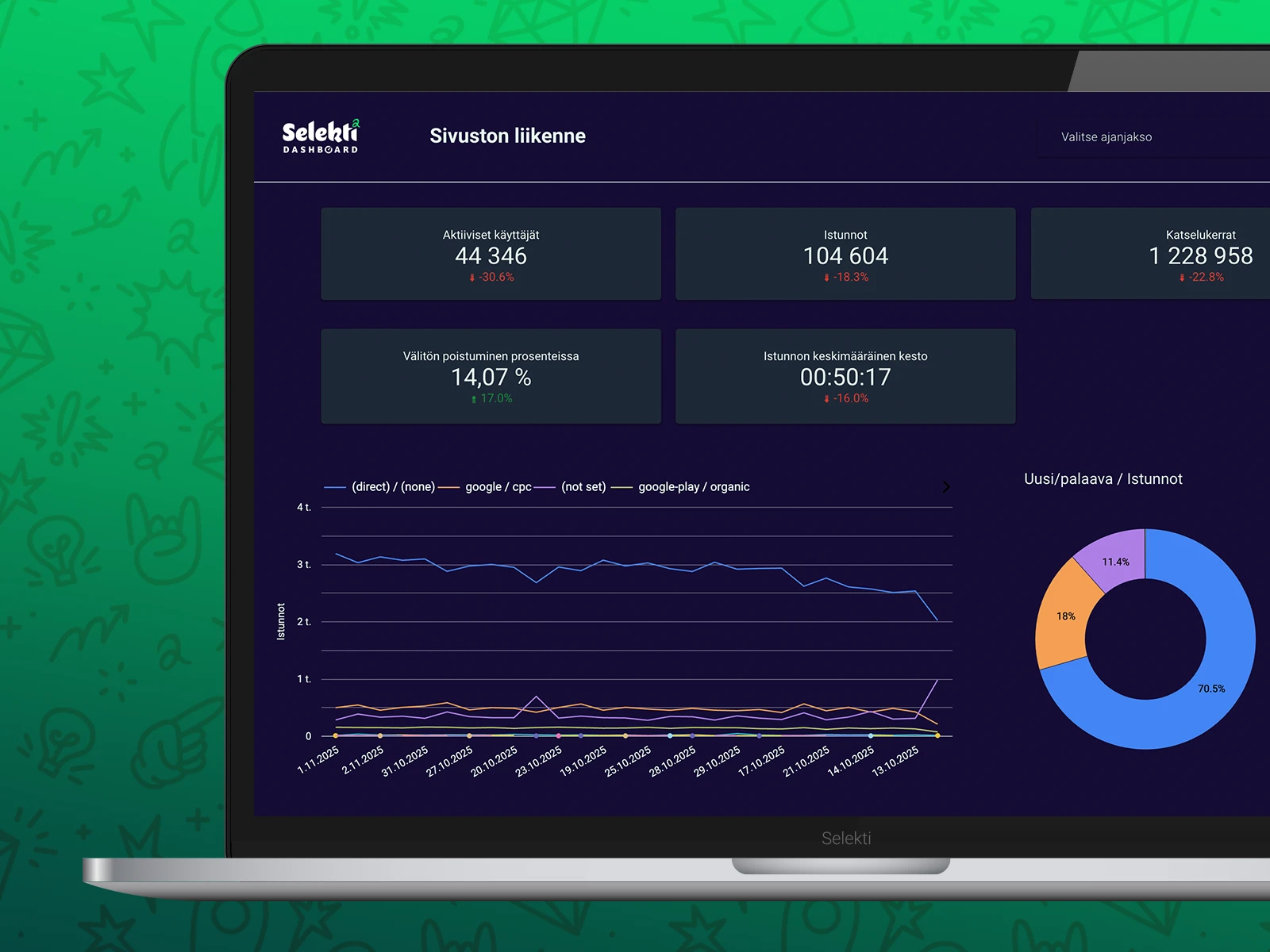 Selekti Dashboard kerää kaiken merkittävän tiedon yhteen keskitettyyn paikkaan. Käytössäsi on oikea tieto oikeaan aikaan päätöstesi perusteena. Selekti Dashboardilla saat selkeitä hyötyjä, kuten